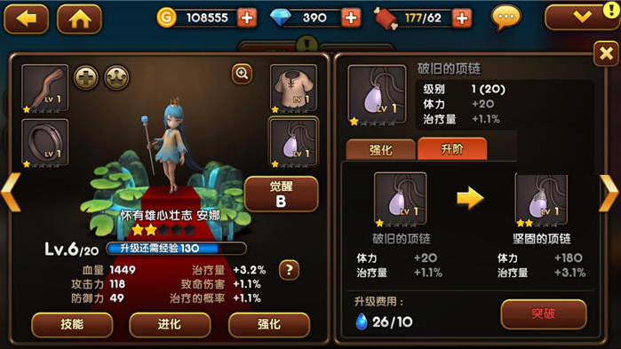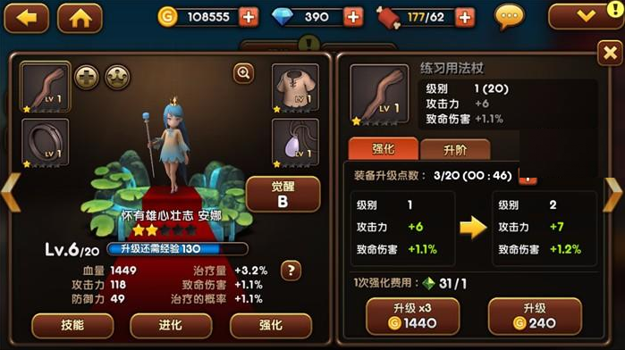 强化就是英雄的等级提升了,英雄的等级20级为一个阶段,在升星和觉醒之后,会开启一个新的阶段。玩家对英雄使用经验材料人参果即可完成经验值的注入,等级的提升。