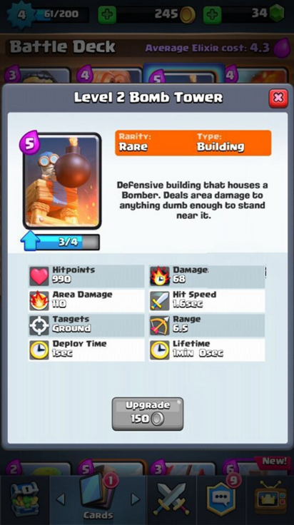 关于炸弹塔的培养小编不建议升级太高,因为后面肯定要换掉的,升到3-4级就差不多够用了,后期可以用法师同样的范围攻击兵种来替换。