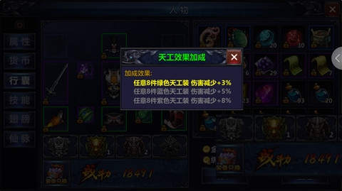 最后在行囊之中,可以看到比较关键的角色效果加成;包括:装备强化效果加成、装备天工效果加成、成就称号加成、血阶等级加成;
