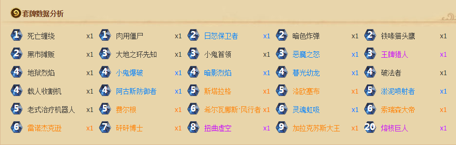 起手:肉用僵尸,黑暗炸弹,铁喙猫头鹰,黑市摊贩,大地之环先知,小鬼首领,精神控制技师,地狱烈焰,暮光幼龙,洛欧塞布,雷诺杰克逊。