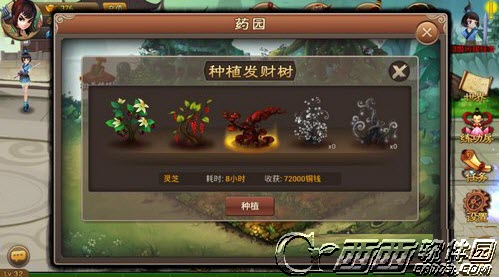 在药园中种植发财树可以收获大量铜钱,发财树的等级越高,一次性收取的铜钱越多,但是等待成熟的时间也很长。小编算了一下,虽然发财树等级不同,但是获得的铜钱总量是一样的21W6,也就是说,如果一天24小时都保持一直在种植发财树的话,赚的钱是一样的,但是如果继续用钱强化装备或者购买东西的话,可以选择成长时间较短的树。起始只能种植一棵树,可以使用元宝解锁位置,最多8棵。