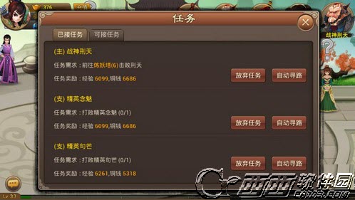 主线任务不多说,必须完成的任务,可以获得大量经验和铜钱,支线任务在主线任务做到不足等级接取时才去做,一般支线任务都是扫荡副本杀怪或者拿材料的,也可获得很多铜钱。