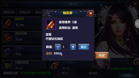 首先就是抽奖券,对于不能够进行钻石抽奖的平民玩家,抽奖券也算是一种替代品,但是需要300绑钻,比直接抽奖要贵上100,比较不划算,由于运气成分比较大,不建议玩家购买抽奖券;