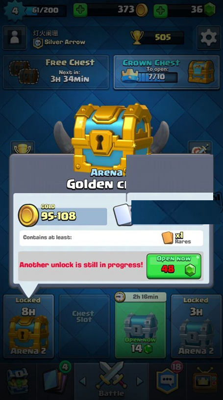 提醒:关于紫箱的话,一般在2-3本,1-2级竞技场就可以开1-2个!排在12位,第二个紫箱在132位,前面要开120个箱子,大约是25天后拿到(有参考其他玩家数据,大家可以作为参考,误差其实不是很大,只是要每天计算下获得的箱子数)