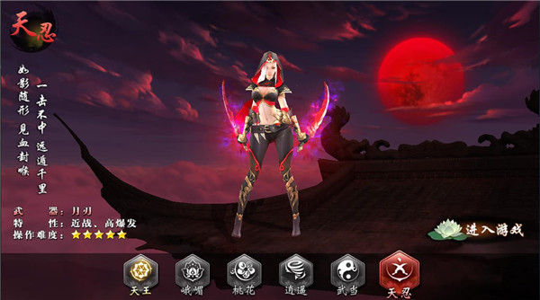 天忍近身刺客,爆发极强。隐藏在曼妙招式的背后是天忍高强的爆发力和奇门道术,打出无人能出其右的雷霆之势。隐身偷袭,瞬间爆发,在PVP中往往让对手防不胜防。生存能力稍逊, PK时跳跳更健康,操作较难,手残者慎选......