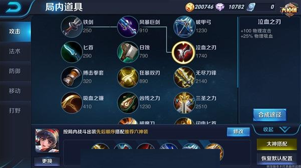 出装上,可选择【无尽刀锋】、【泣血之刃】、【破军】、【破甲弓】这四件装备来提升娜可露露的普攻和技能伤害。【冷静之靴】可以增加娜可露露的移动速度并减少技能冷却时间,【不祥之刃】or【振兴之凯】则是能提高她的防御属性。