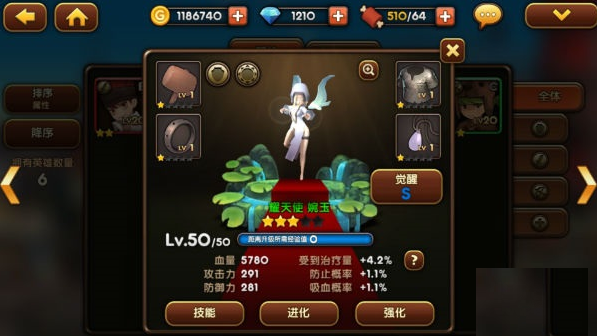 - 英雄的能力值信息。根据等级、装备强化和觉醒,能力值会提高。