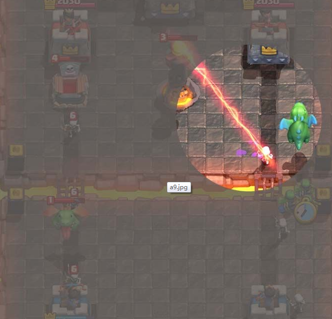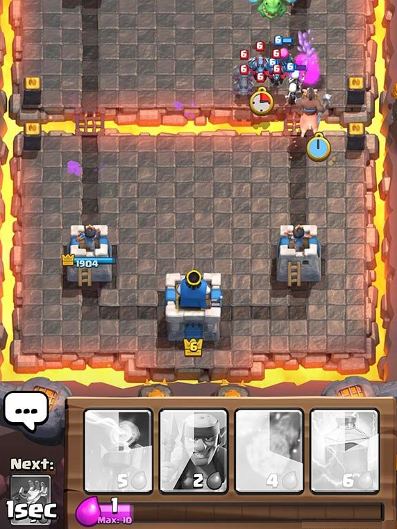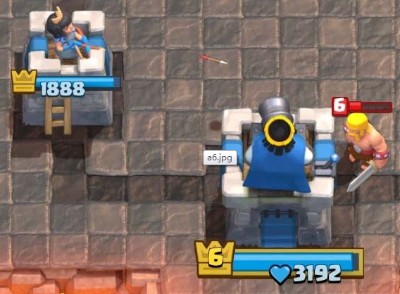 上图中还剩一个野蛮人在砍你的国王塔,这时候你真的需要放出你的弓箭手来消灭他吗?不,你并不需要。你的国王塔可以轻松地解决掉他,如果你放了弓箭手,你就是浪费了3点圣水,然后这个弓箭手会慢慢地走向敌方的护卫塔,并且到死都没有任何贡献。