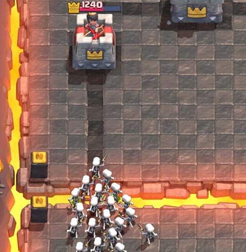 但是游戏中经常出现的情况就是,你尝试着把自己的军队一股脑地全下在一边来尝试推掉对面的护卫塔,然后对面用了大部分军队来防守你这波进攻,同时在另外一路下了一个野猪骑士或者其他类似的卡牌来攻击你的另一个毫无防御的护卫塔。最后的结果就是你自己的塔被推掉了,而你并没有推掉对面的塔。
