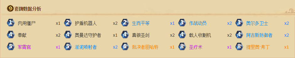 调整就中速骑来说效果并不好,因为这套牌的骨架很定性。。你几乎没法改变他的性质,不像牧师卡组,可是有很大的调整空间。所以这里直接给出我觉得最优的中速骑方案。中速骑万年不动的核心卡表如下: