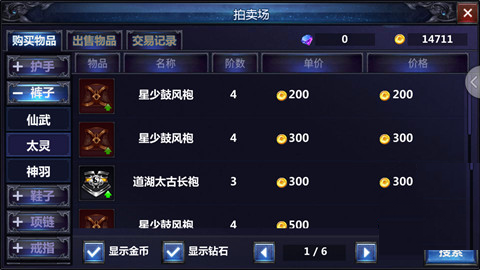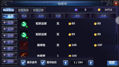 在拍卖场之中,可以看到详细的物品分类,包括武器、头饰、项链、戒指等等;