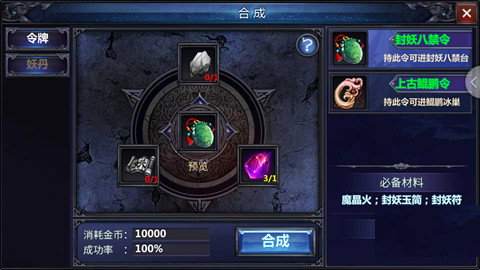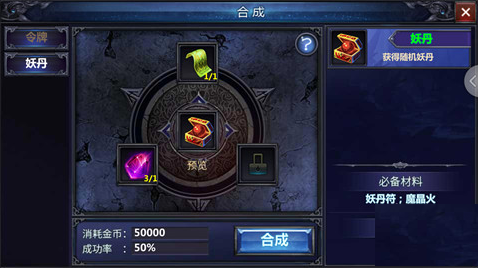 合成妖丹需要消耗妖丹符以及魔晶火,注意合成消耗有一定的成功率,失败了也会消耗材料和金币;