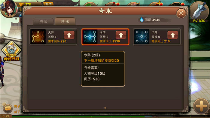通过系统的奇术--阵法,通过消耗阅历可以升级不同的阵法。阅历可以通过副本及系统玩法和活动得到。