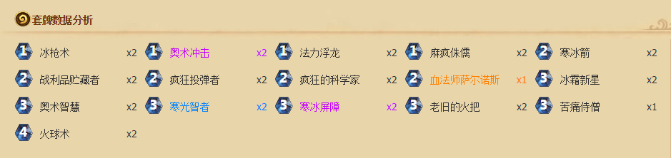 这套卡组并没有带板娘,因为大部分时候板娘是抽不到射箭或者抽牌的,而别的英雄技能远远不如法师的火冲。这套牌放弃了奥蛋,换成了奥冲。奥冲相对于奥蛋输出更加稳定,在有血法加成的时候伤害翻倍,可以打出不俗的伤害。如果环境中咆哮德较多的话,可以把一个战利品换成镜像,镜像再打德鲁伊的时候效果还是不错的。在4费或者5费的时候丢下去往往会卡到对面的收割机和熊德,弊端就是在你想要屏障的时候,科学家有可能拉出镜像。