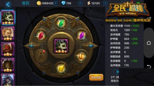 首先给大家介绍下宝石系统,在《全民超神》中,每个英雄最多可以携带6种不同类型宝石,每10级可以增加一个宝石孔,用来镶嵌宝石。宝石分不同等级,每4块同类型同等级宝石可以合成1块同类型高等级宝石,高等级宝石会大幅增加宝石附加的属性。