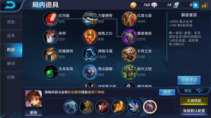 最后再补上一件霸者重甲,拥有2000生命和高生命恢复,又增加了李白的生存能力。