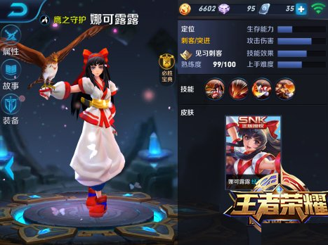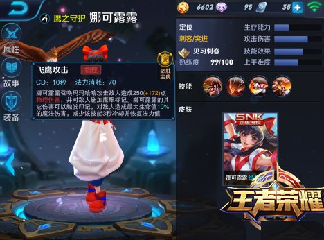 首先我们看一下娜可露露一技能和被动技能的介绍,首先要知道娜可露露的被动技能是娜可露露仅能命中敌人之后会附加攻击,一定是命中敌人之后的状态下攻击敌人提高伤害,然后我们再来看一下主要输出的一技能,一技能就是施放标记,敌人受到飞鹰的伤害后,首先娜可露露的被动技能就触发了,下一次攻击提高攻击力,然后在对方有标记的状态下攻击敌人,敌人会受到10%的魔法伤害,并且减少一技能3秒的冷却时间。