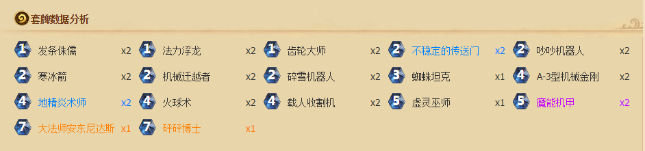 这套卡组引用了A3的续航、大法师以及虚灵老道,基本上不需要过牌还能保证一定的续航,其实就是加快版的机械法,对于我这种卡手的人来说,根本没有说好得人与人之间信任,全TM是套路,5费让王牌蹦掉,双魔能就不用说了,他和魔能德的区别就是,他没有那么天湖跳费,所以他的魔能仅仅是可以丢失的棋子的类型,但是可以增加自己强度,还不至于被目前毒瘤横行的快攻直接打死,有点介于恶魔和佛祖的中间的感觉。