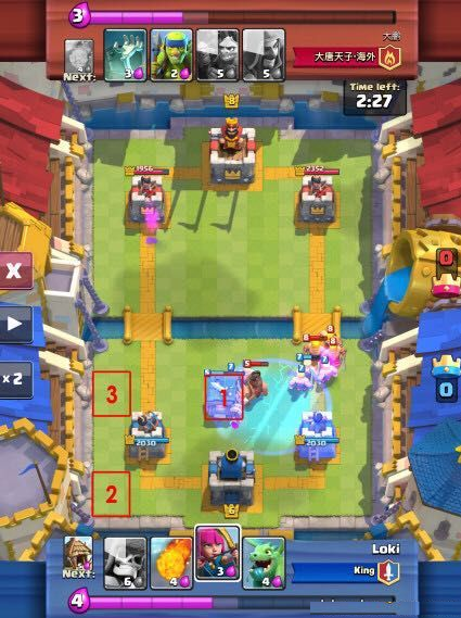前2分钟普通的一倍圣水时间少下或不下野蛮人营,因为一个野蛮人营就是7费,对面可以趁这一波费差很可能强行推一路。对面给你的压力较小可以下哥布林营蹭血,压力大就慢慢解场,他扔一张你扔一张,这样的防守过后一般就会打出一波费差,可以选择强攻或者下一个7费房子给对手持续的压力,到了双倍圣水时间优先下房子,一般房子都会放在一路,所以时刻小心对面在另一路偷掉我们的塔,可以在手中适当留些解牌