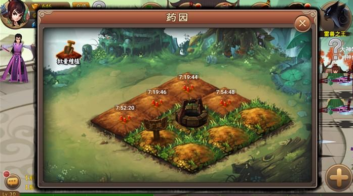 通过种植龙芽草、月桂、灵芝、人参果、神秘树,分别需要2-4-8-8-2小时,可以得到大量的铜钱奖励,单纯的人参果8小时都可以得到12.8w铜钱奖励。