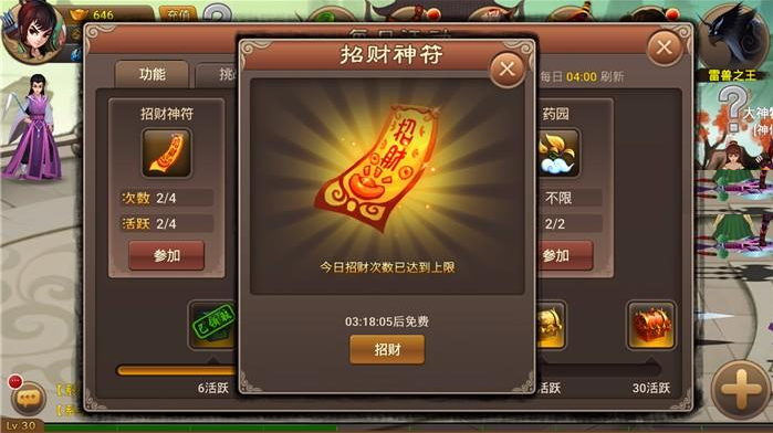 每次招财都可以得到5w铜币的奖励,并且只需要花费2元宝,当然,玩家的vip等级越高,可用元宝招财的次数越多。其他则可以通过免费次数招财,每次招财之后,都会有3.5h的冷却时间,冷却时间过后,玩家才可以继续招财。