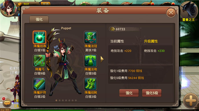 装备的培养总体来说比较简单粗暴,常规的就是强化,通过强化装备可以提升装备的属性从而提升战斗力,但是强化是需要大量的铜币的,只要你有大量的铜币,就不愁装备培养不上去。