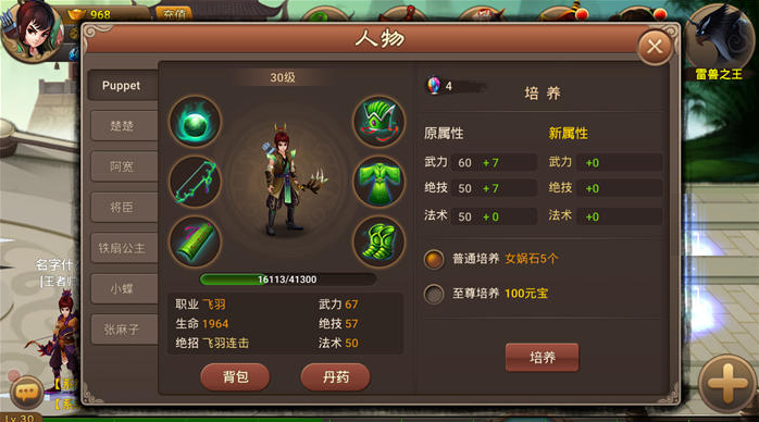 培养随机提升伙伴的武力、绝技、法术三项属性,当然并不一定都是上升,玩家可以根据实力情况,上升保存,下降取消。