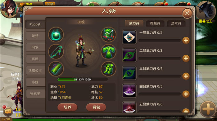 伙伴的培养是主要核心途径,分为等级、培养、丹药、装备4个方面。
