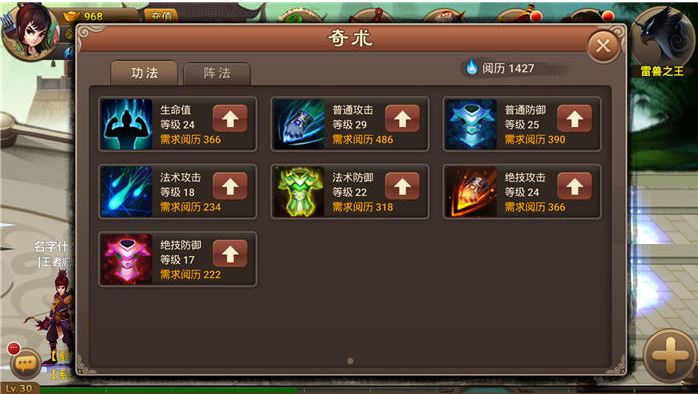 最后,对于功法和阵法的培养,由于阅历的需求简直不在一个档次上面,阵法的需求实在太多,前期推荐优先培养功法,阵法在中后期再慢慢培养。