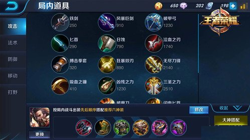 装备路线:出门装备可以买一件狩猎宽刃,中期可以考虑卖掉狩猎宽刃,出黑色战斧,影忍之足,振兴之铠,后期再出不祥之兆,霸者重装,爆裂之甲。
