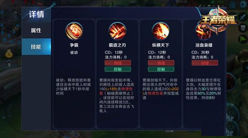 曹操的被动技能有效提高了曹操的持续输出能力,在对线时利用攻击敌方单位可以多次消耗对方英雄。一技能,是3段的位移技能,这个技能可以提高曹操的有效地进入团战的能力。二技能是个可以利用被动技能持续消耗的使用型技能。大招则是提高曹操的攻击力与韧性(就是被控制的时间缩短)还有物理吸血效果,大大提升了曹操的输出能力与生存能力。