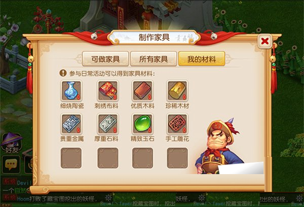 家具合成是用日常当中获得的材料进行合成,当然不够可以自己掏腰包补银币来制作哟。