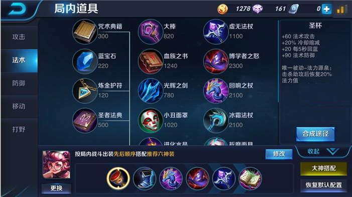 中期装:圣杯+秘法之靴+大棒。圣杯可以增强自己线上的消耗能力,秘法之靴和大棒则是可以增强自己的单秒能力