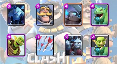 这次他推荐的卡组是:亡灵、骑士、迷你皮卡、飞龙宝宝、哥布林飞桶、万箭齐发、亡灵大军、哥布林。