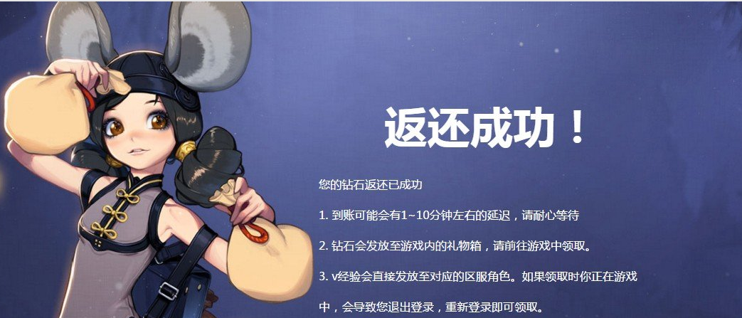 4.所有钻石和VIP一次性返还到玩家最终选择的账户,不分数量,不分批次返还,钻石返还成功后请到游戏内领取。