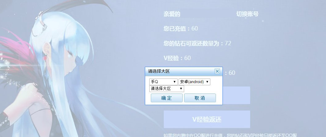 3.确认返还您的钻石以及VIP经验,并选择对应的区服信息和角色(请注意,请先进入游戏建立角色后,再使用返还功能)