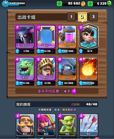 皇室战争牌库有八张牌,在手上的只有四张,因此要保证同时有2-3张卡牌能够满足同一用途,才能在短期最大化圣水的效用。