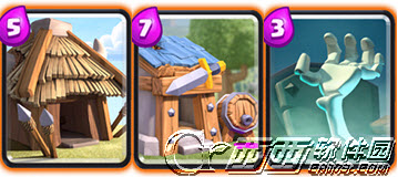 建筑类卡牌是人海流战术的核心,因为输出小兵能力实在是无人能敌。。而墓碑虽然属于低费牌,但由于近期被削弱之后已无太强生存能力所以被玉米遗弃了。而这次选用的是一个高费偏慢速的卡组,但野蛮人的体格确实比骷髅要强很多,虽然生产速度较慢,但只要能跟上节奏好好利用,还是一张好牌。