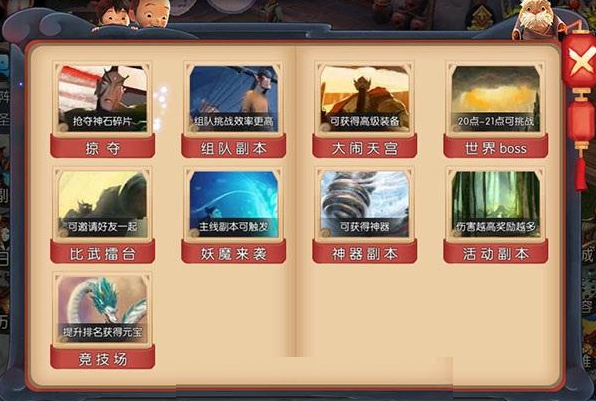 点击副本即可直接进入任务剧情副本;点击日常可以看到日常完成的任务,进入后日常界面后,点击对应的任务即可快速开启该任务;点击历练入口,直接开启历练副本,历练里面的玩法掠夺、组队副本、大脑天宫、世界boss、比武擂台、妖魔来袭、神器副本、活动副本、竞技场。