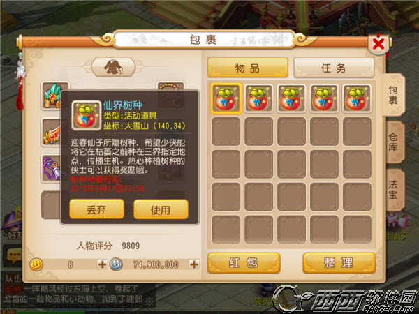 天庭特派迎春仙子下界将仙界树种播撒在凡间,希望三界侠士积极种植,以让绿色遍布三界。带着迎春仙子送来的树种,去完成种植任务就能获得经验和物品奖励。