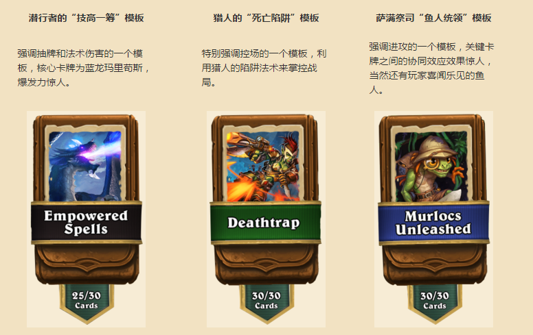 经典模板的主体是由基础和经典卡牌构成的,藉此玩家可以迅速了解到职业特色和传统打法。此外,新玩家还可以通过经典模板来熟悉套牌的构筑过程。同时对于经验丰富的老玩家而言,即选即用的经典模板也省去了自己选牌的麻烦。