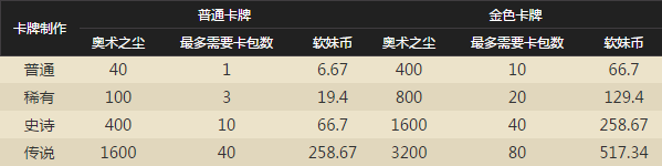 假设,你需要GVG中的一张普通卡牌,既40尘,相当于1卡包全分解的价值。你可以从下表中看到制作GVG卡牌的对应价格。