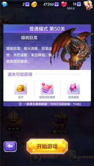 第50关卡为BOSS关卡,所以没有一星、二星要求,玩家只要击败BOSS就能三星过关。最低能量要求为1000能量,高额的能量要求意味着本关卡的强度之高。了解了关卡类型和三星要求后,我们应该在阵容上有所针对,玩家们应该准备高能量、高续航能力的阵容来应对本关卡,特工papa这里用的是高能量、破坏续航的角色“魔力可可”和续航能力不错的宠物“大地之灵”,滑翔伞和宝物选择与角色或者宠物有最佳搭配效果的即可。