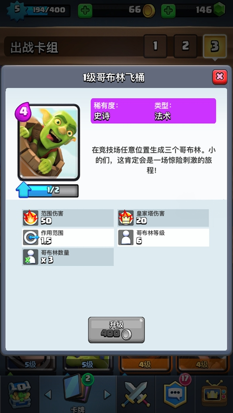 后面哥布林桶也可以用来偷袭,趁着对方没费用上卡,就丢塔上,别小看桶兵,很可能就是你成功的关键了,小编一般在对方上了高费兵突击,我们能抗的情况下,上桶绿皮,对方无法出兵防守,3个桶兵能削去塔部分血,塔若只剩几百那就拿下塔了。
