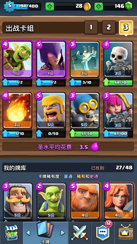 这组卡牌中核心是哥布林桶,平均费用是3.5点。而且较多防御类型卡,兵种容易获得,属于平民套牌。