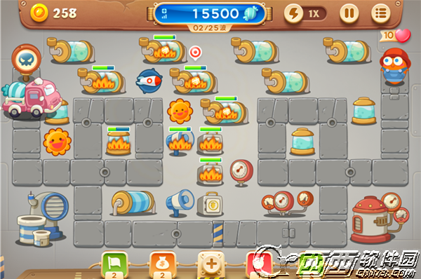 每经过一段时间,游戏中就会刷出一辆金币车。玩家要保护金币车安全的抵达终点,所以减速萝卜必不可少。无论是冰冻星还是雪球,放在一个有利的位置能为你赢得不少时间。金币车一旦抵达终点则会给玩家部分的金币奖励,千万别让它被怪物吃掉了哦。