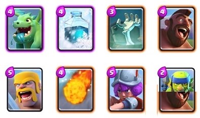 先来看看本人准备的卡组:龙宝宝、冰冻术、墓碑、野猪、长矛哥布林、野蛮人、火球术、火枪手,平均3.8圣水的阵容。