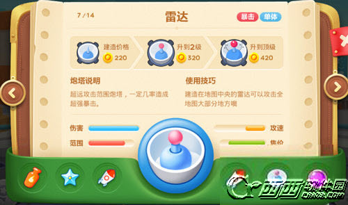 雷达,作为新时代的炮塔雷达的攻击距离变态的达到半张地图那么大,而且雷达不可怕,雷达暴击最可怕,雷达的暴击可以说是一种随机性的存在,有时候可能一局都不一定暴击一次,也有时候次次暴击打的怪物不要不要的,但是雷达既然攻击距离远,攻击力高!那么也一定有缺点了,那就攻击速度太慢,即使有瓶子炮的加成,雷达的攻击速度也是慢的要命,所以如果在资金不够的情况下,不要贸然的去建造雷达,因为雷达很烧钱!