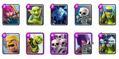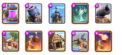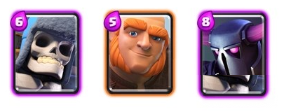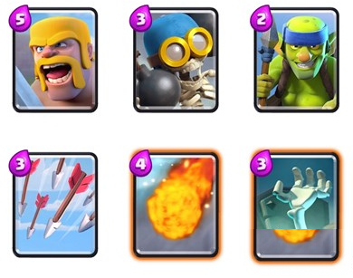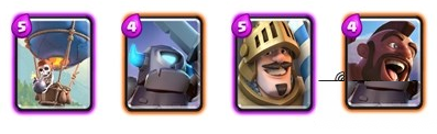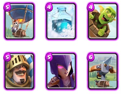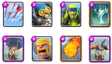 这6张史诗卡牌中,一般都会有2种以上,配合之前推荐的6张卡牌,可以组成一套不错的上分卡组。如果拥有X连弩,可以考虑选择这张做为固定的核心卡牌,因为X连弩往往能在消耗战中找到机会"偷掉"对方的护卫塔。最后一张的话,比较推荐用空中爆发的气球兵,因为气球兵相比于王子的突进,不会受到骷髅兵或者野蛮人的干扰,且爆发输出高。所以,在这个阶段,我们可以总结出一套容易组成的的兼顾防守与输出的上分卡组。