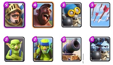 最近野猪加双哥布林组合在巅峰对决也是一个常客,于是改了这么个卡组,思路在于换边速攻,把对手带入你的节奏去被动防守,而你可以趁机摸塔。